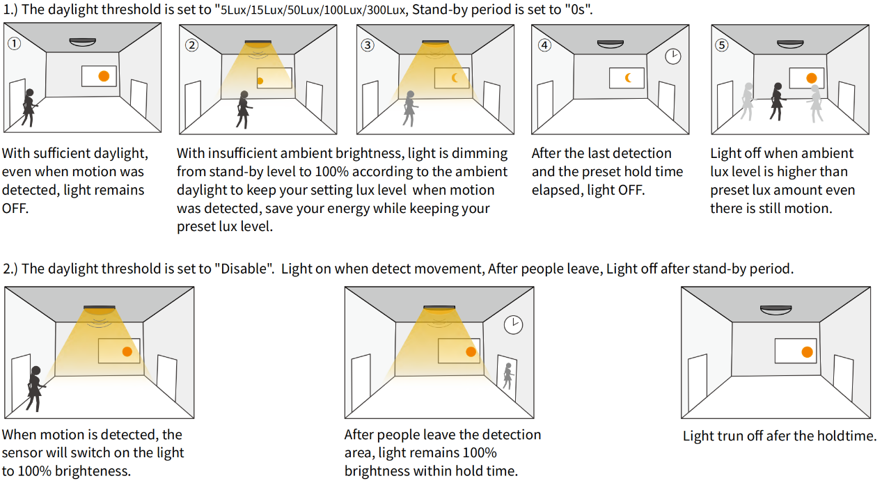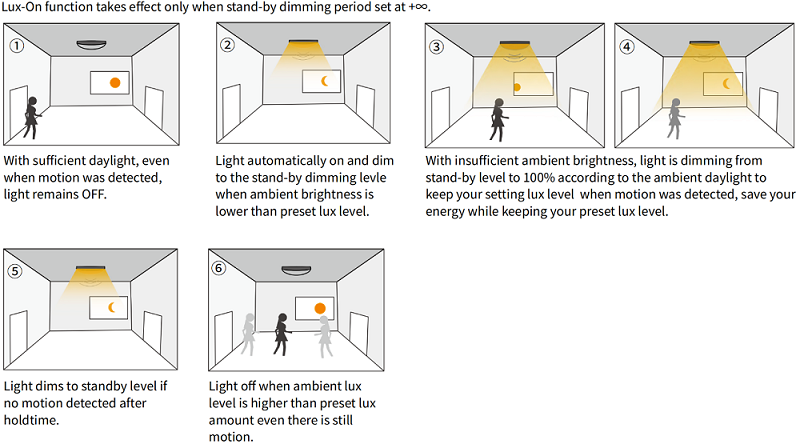 1. Pengesanan gerakan + Penuaian Siang + Lux On/Off Fungsi