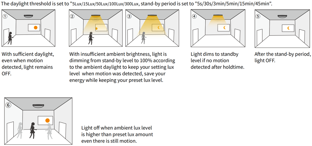 Terima kasih kepada teknologi dwi-PD, sensor MC004-S02R dapat memberitahu perbezaan antara cahaya semulajadi dan cahaya LED buatan. Sensor akan menghidupkan lekapan cahaya anda apabila cahaya ambien lebih rendah daripada nilai tetapan, walaupun tidak ada gerakan yang dikesan. Apabila lampu ambien terpulang kepada nilai tetapan, sensor akan mematikan lekapan cahaya walaupun masih ada gerakan.