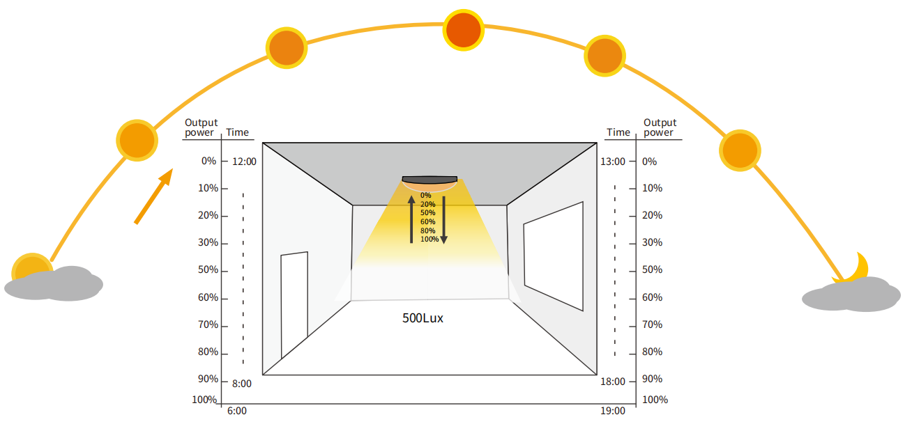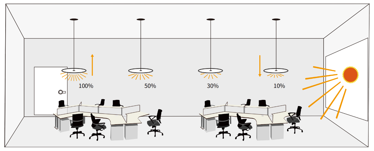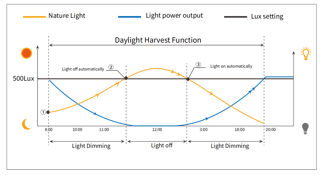 Penuaian siang hari - secara automatik merasakan keamatan cahaya ambien dan secara dinamik menyesuaikan kecerahan lampu untuk mengoptimumkan penggunaan tenaga;
