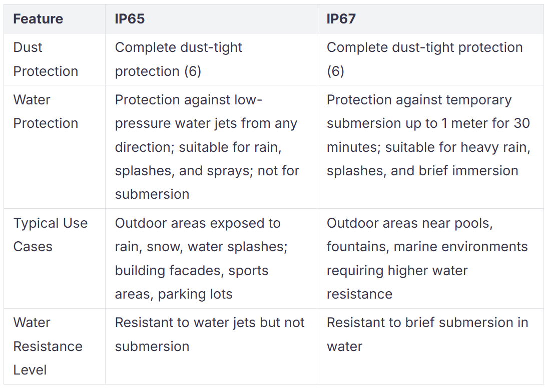 Apabila memilih pencahayaan cuaca LED, fokus pada bagaimana kalis air itu. Penarafan IP menunjukkan seberapa baik cahaya menjauhkan debu dan air. Bagi kebanyakan tempat luaran, pilih lampu dengan sekurang -kurangnya IP65. Penarafan ini menghalang semua habuk dan melindungi dari hujan atau percikan. Jika anda tinggal berhampiran lautan atau mempunyai lampu oleh kolam, anda memerlukan perlindungan yang lebih kuat. Lampu IP67 boleh mengendalikan berada di bawah air untuk masa yang singkat. Mereka baik untuk kawasan basah atau marin.