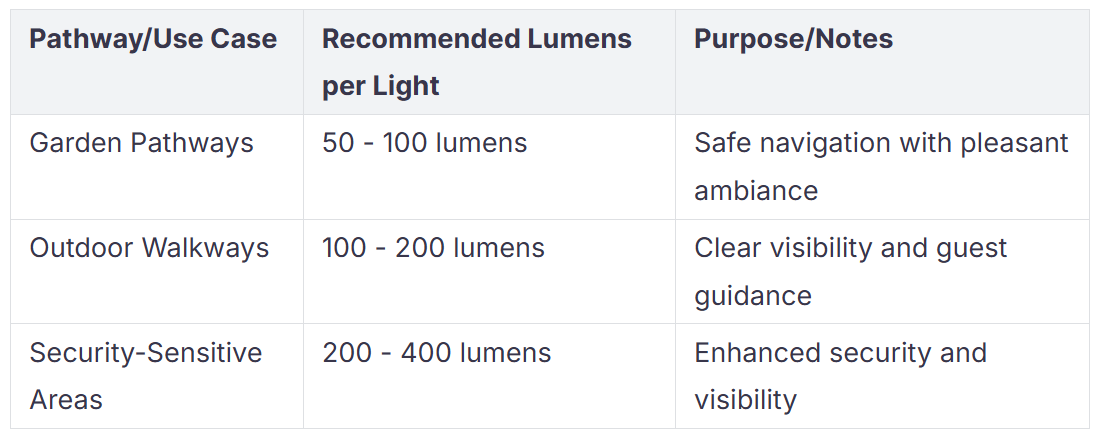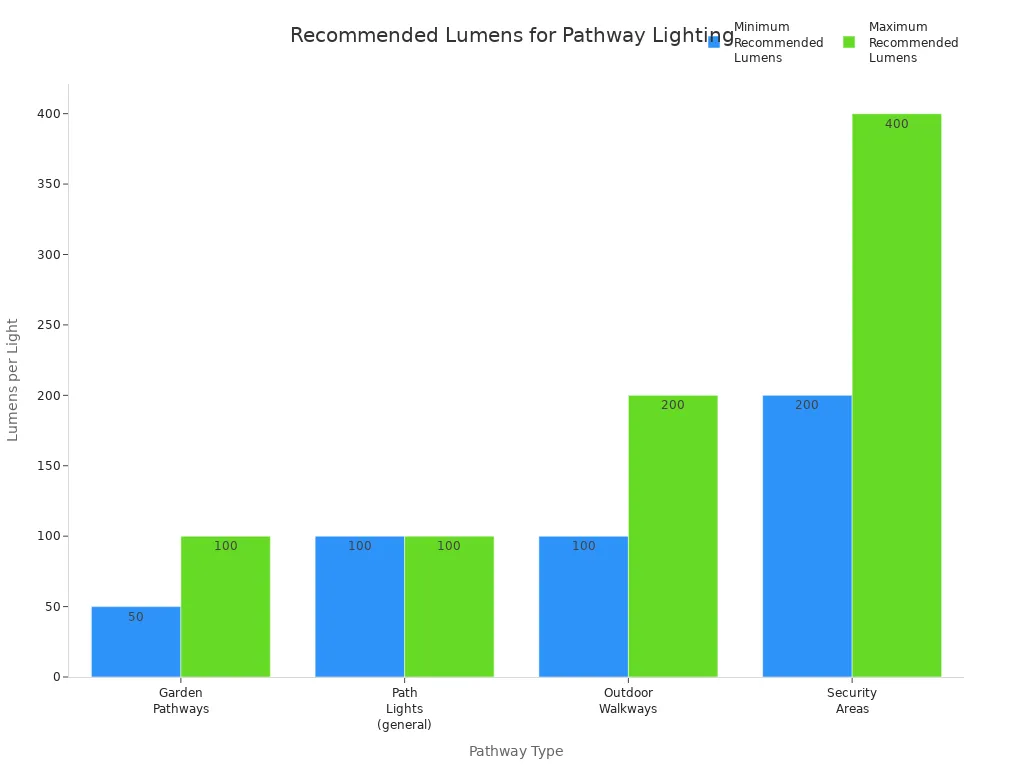 Adalah penting untuk mempunyai laluan yang selamat di luar. Pencahayaan laluan membantu orang melihat di mana hendak berjalan. Ia juga menghentikan perjalanan dan jatuh. Untuk laluan taman, gunakan lampu dengan lumens 50-100. Jalan pejalan kaki memerlukan 100-200 lumen untuk cahaya yang baik. Jika anda mahukan lebih banyak keselamatan, gunakan 200-400 lumen setiap cahaya. Letakkan lampu LED luaran 6-8 kaki selain cahaya. Jalan sempit memerlukan lampu lebih dekat bersama -sama. Laluan yang luas boleh mempunyai lampu lebih jauh. Letakkan lampu kira -kira 14 inci di atas tanah. Ini memberikan rasuk langsung dan menjadikan jalan kelihatan bagus.