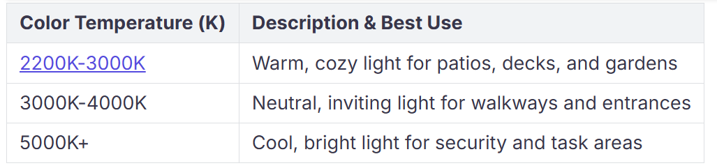 Memilih suhu warna yang betul mengubah bagaimana ruang anda terasa dan berfungsi. Cahaya hangat, dari 2200k hingga 3000k, menjadikan tempat merasa selesa dan ramah. Gunakan ini untuk teres, dek, atau taman di mana anda ingin berehat atau bersenang -senang dengan rakan -rakan. Putih neutral, antara 3000k dan 4000k, memberikan cahaya yang jelas yang tidak terlalu terang. Ini bagus untuk laluan pejalan kaki dan pintu masuk supaya anda dapat melihat dengan baik tanpa menyakiti mata anda. White sejuk, di atas 5000k, sangat cerah dan tajam. Gunakan ini untuk pencahayaan keselamatan atau tempat di mana anda perlu melihat semuanya dengan jelas.