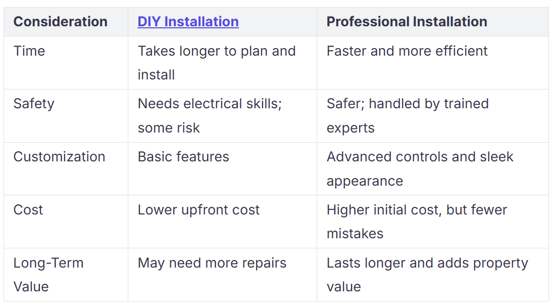 Mendapatkan lebih banyak kos profesional tetapi memberi anda bantuan pakar. Profesional menggunakan bahan yang baik dan pastikan lampu anda selamat. Mereka boleh melakukan pekerjaan yang sukar dan menambah ciri khas.