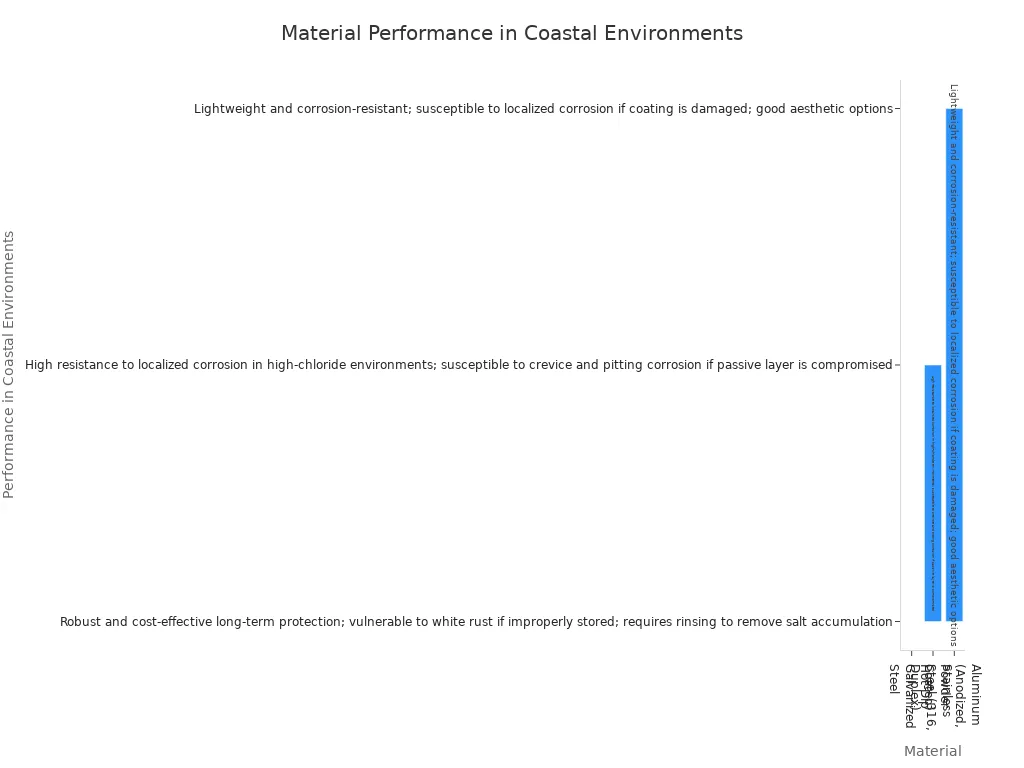 Pengilang menggunakan selesai serbuk dan penutup tertutup untuk membuat lampu bertahan lebih lama. Ciri -ciri ini membantu pencahayaan cuaca yang diketuai oleh ribut, udara basah, dan semburan garam. Anda dapat melihat bagaimana bahan -bahan yang berlainan berfungsi berhampiran laut dalam carta di bawah: