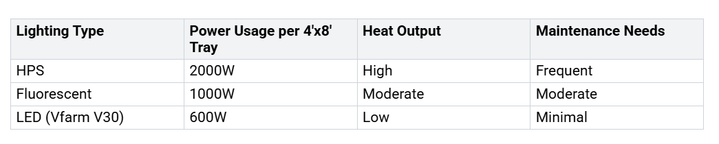Kos tenaga boleh membuat atau memecahkan taman dalaman anda. LED tumbuh lampu menonjol untuk kecekapan yang luar biasa dan penggunaan tenaga yang rendah. Apabila anda beralih dari natrium tekanan tinggi tradisional (HPS) atau lampu pendarfluor ke LED, anda boleh memotong penggunaan tenaga anda olehdan. Dalam pertanian menegak berskala besar, LED menggunakan mengenai600W per 4'x8 'dulang, sementara sistem HPS memerlukan sehingga 2000W untuk kawasan yang sama. Ini diterjemahkan kepada penjimatan tenaga yang ketara dan bil kuasa yang lebih rendah. LED juga memancarkan haba yang kurang, yang bermaksud anda menghabiskan lebih sedikit penyejukan dan boleh meletakkan lampu lebih dekat dengan tanaman anda. Pemandu bersepadu VFARM V30 dan reka bentuk kalis air IP65 memastikan prestasi yang boleh dipercayai dalam persekitaran yang menuntut, mengurangkan kos penyelenggaraan dan operasi.
