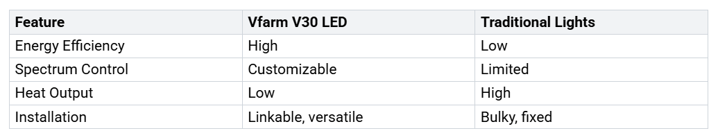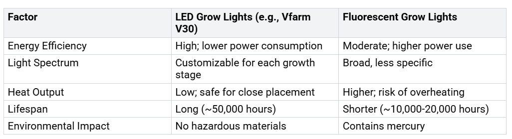 Apabila anda membandingkan LED tumbuh lampu ke pilihan pendarfluor, anda melihat kelebihan yang jelas dikecekapan tenaga, Kesihatan tumbuhan, dan penyelenggaraan. LED seperti FanXStar VFARM V30 menawarkan spektrum cahaya yang disesuaikan, jangka hayat yang lebih lama, dan operasi yang lebih selamat. Lampu pendarfluor, seperti tiub T5, menggunakan lebih banyak tenaga, menghasilkan lebih banyak haba, dan mempunyai jangka hayat yang lebih pendek. Mereka juga mengandungi bahan berbahaya seperti Mercury, yang memerlukan pelupusan khas.
