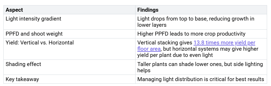 Anda melihat bukti yang jelas dari kajian saintifik bahawa lampu menegak dapat mengubah pertumbuhan dan hasil tumbuhan. Penyelidik telah mengukur bagaimana intensiti cahaya berubah dari bahagian atas ke pangkal lajur menegak. Mereka mendapati bahawa lapisan yang lebih rendah sering menerima cahaya yang kurang, yang boleh mengehadkan pertumbuhan. Walau bagaimanapun, apabila anda menggunakan strategi sampingan atau intervi, anda boleh meningkatkan pendedahan cahaya untuk semua lapisan dan meningkatkan produktiviti.